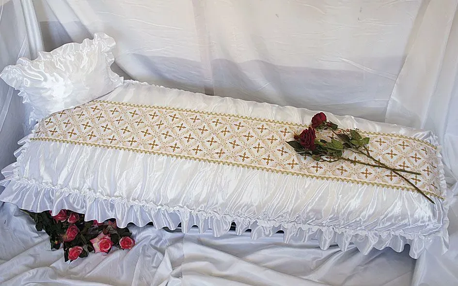 - Похоронный комплект атласный: тапочки ритуальные, покрывало, подушка